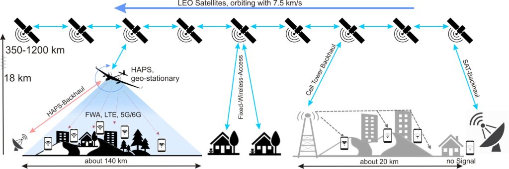 HAPS dự kiến sẽ là một trong những mạng chính sẽ hỗ trợ cơ sở hạ tầng mặt đất trong các hệ thống viễn thông trong tương lai. Với phạm vi hoạt động rộng (bán kính 500 km mỗi nút) và giảm độ trễ cho chuyến đi khứ hồi (0,13–0,33 mili giây, theo Karabulut Kurt và cộng sự, 2021), HAPS lý tưởng cho các ứng dụng di động và độ trễ thấp yêu cầu kết nối liên tục , vì nó giải phóng các ứng dụng như vậy khỏi gánh nặng của việc phân phối thường xuyên xảy ra trong các mạng mặt đất.