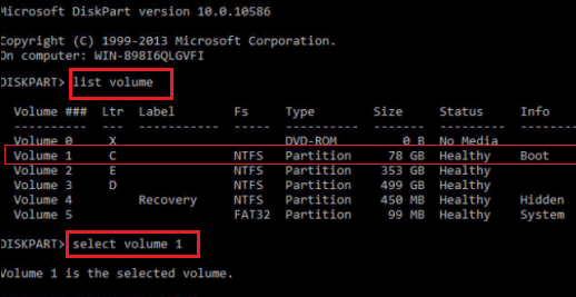 Select disk 0 / Select Volume 1 (Lựa chọn ổ mà bạn Ghost win vào, ví dụ ổ C có volume 1)