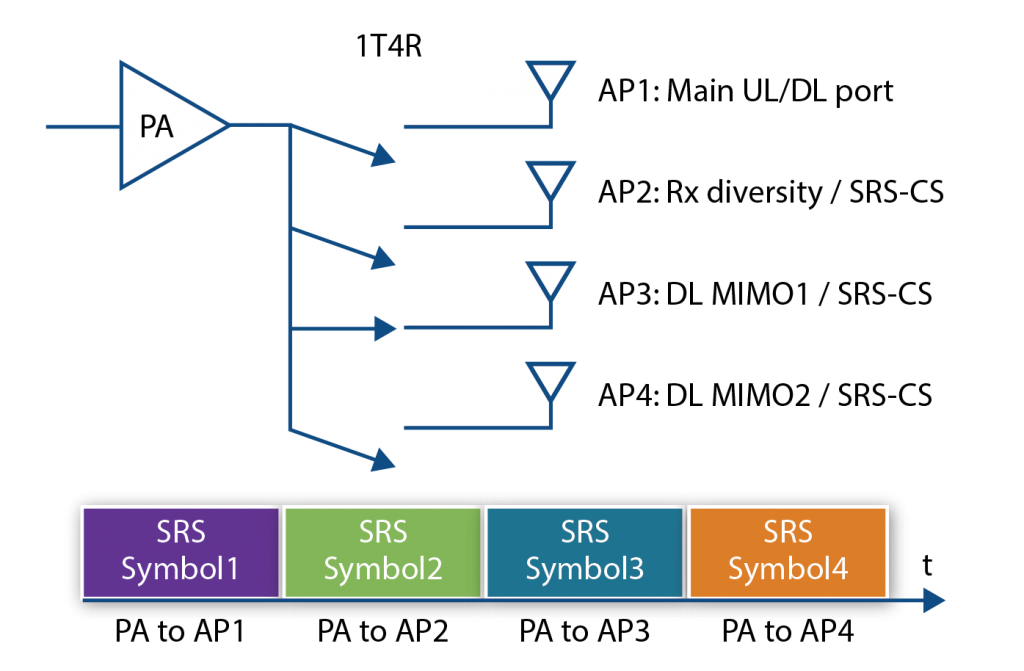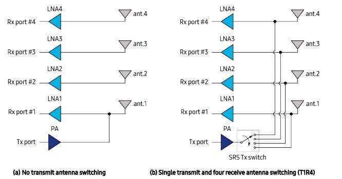 Để tránh những vấn đề như vậy, chuỗi RF phát đơn lẻ (single) có thể được kết nối với một trong các ăng ten thu thông qua một công tắc khi nó truyền SRS (Hình bên dưới). Đây được gọi là chuyển mạch ăng ten phát SRS.