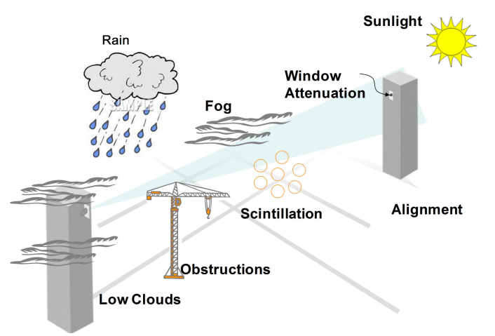 Tuy nhiên, giao tiếp FSO bị ảnh hưởng bởi các hiệu ứng khí quyển, điều này làm hạn chế độ nhạy và tốc độ dữ liệu có thể đạt được với BER chấp nhận được. Một số sự suy giảm này là nhiễu loạn, hấp thụ và tán xạ và các kỹ thuật giảm thiểu khác nhau tồn tại để truyền dữ liệu đáng tin cậy và hiệu quả và để tăng hiệu suất truyền thông.