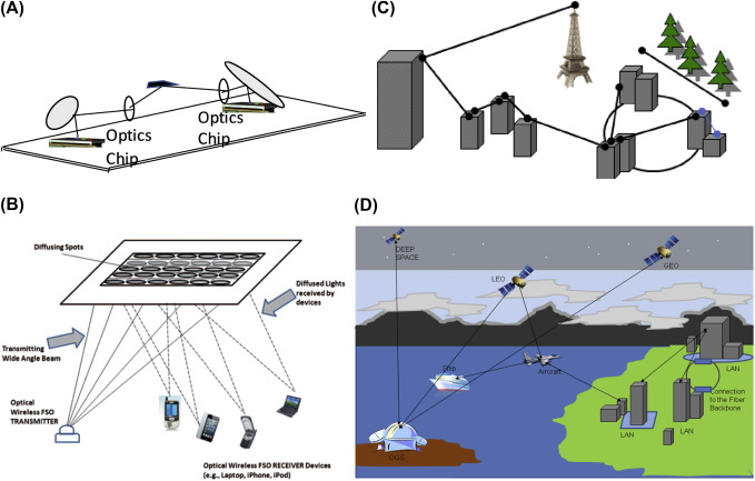 (A) Chip-to-Chip (B) Giao tiếp hồng ngoại trong nhà hoặc ánh sáng nhìn thấy (C) Liên lạc nội bộ (D) Liên lạc laser không gian tự do trên nền tảng không gian tới không gian.